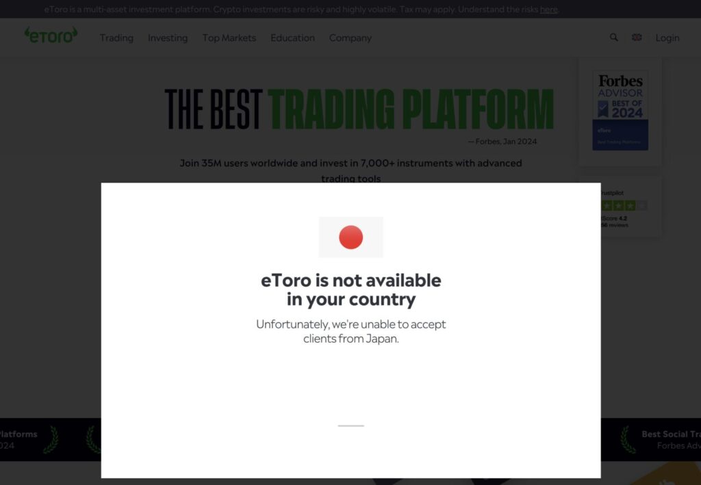 公式サイト(https://www.etoro.com/)にアクセスすると、「Unfortunately, we’re unable to accept clients from Japan.」(=日本からのお客様は受け付けておりません)と表示されます。